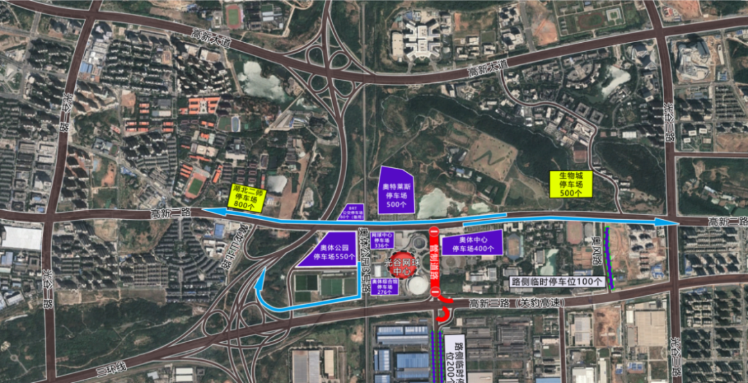 高新二路西向东车辆(奥体中心360停车场、高新二路南侧临时停车泊位、奥风路临时停车泊位),引导至光谷三路进入高新大道驶入三环线或雄楚高架。